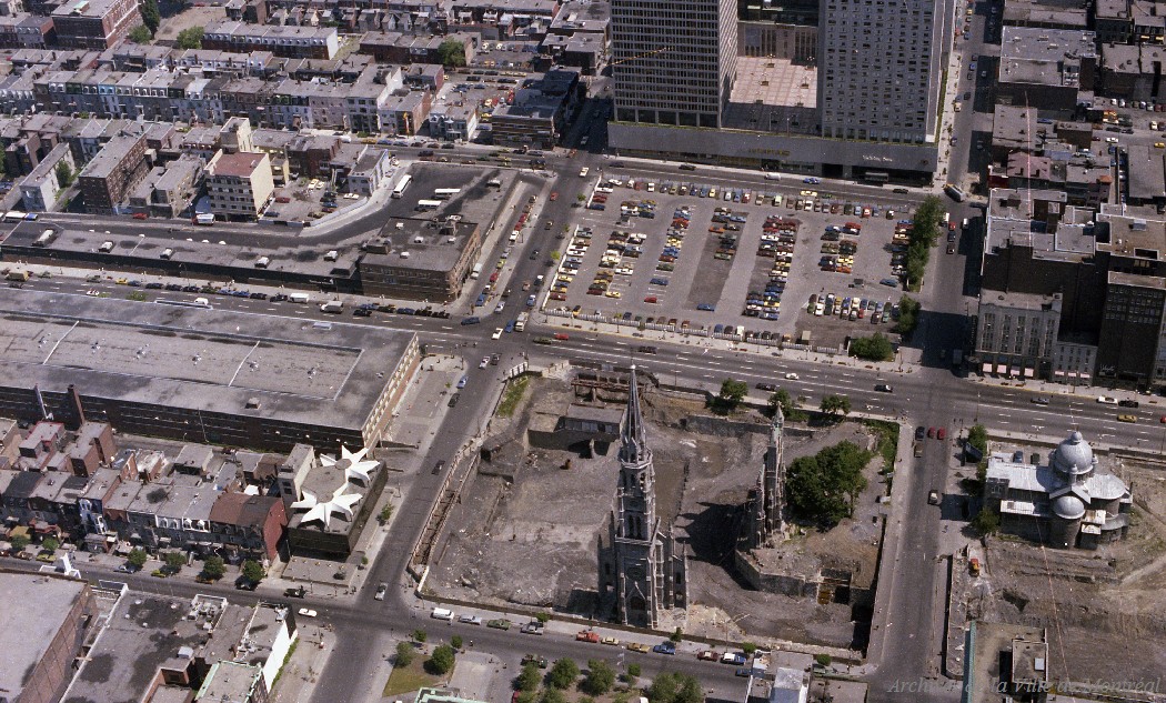 The bell tower of the former Saint Jaques Cathedral and the parking lot that preceded Place Emilie-Gamelin, 9th of June 1976. Photo by Vincent Massaro, credit to Archives de Montréal