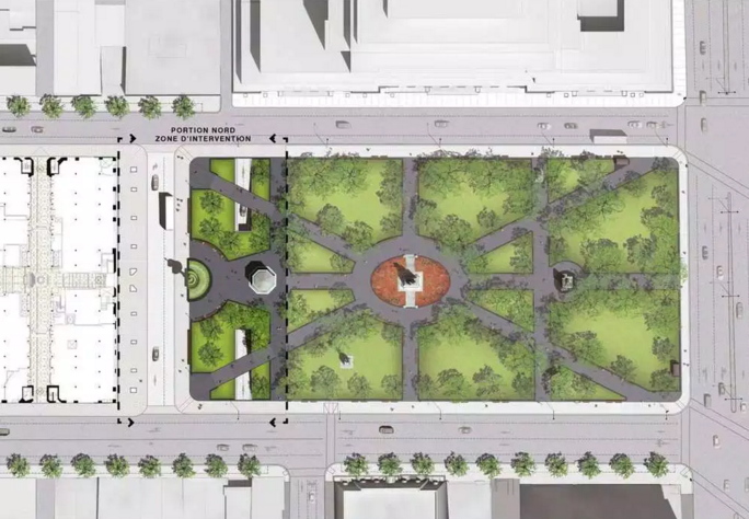 Bird’s eye rendering of new Dorchester Square; note the pedestrian bridges