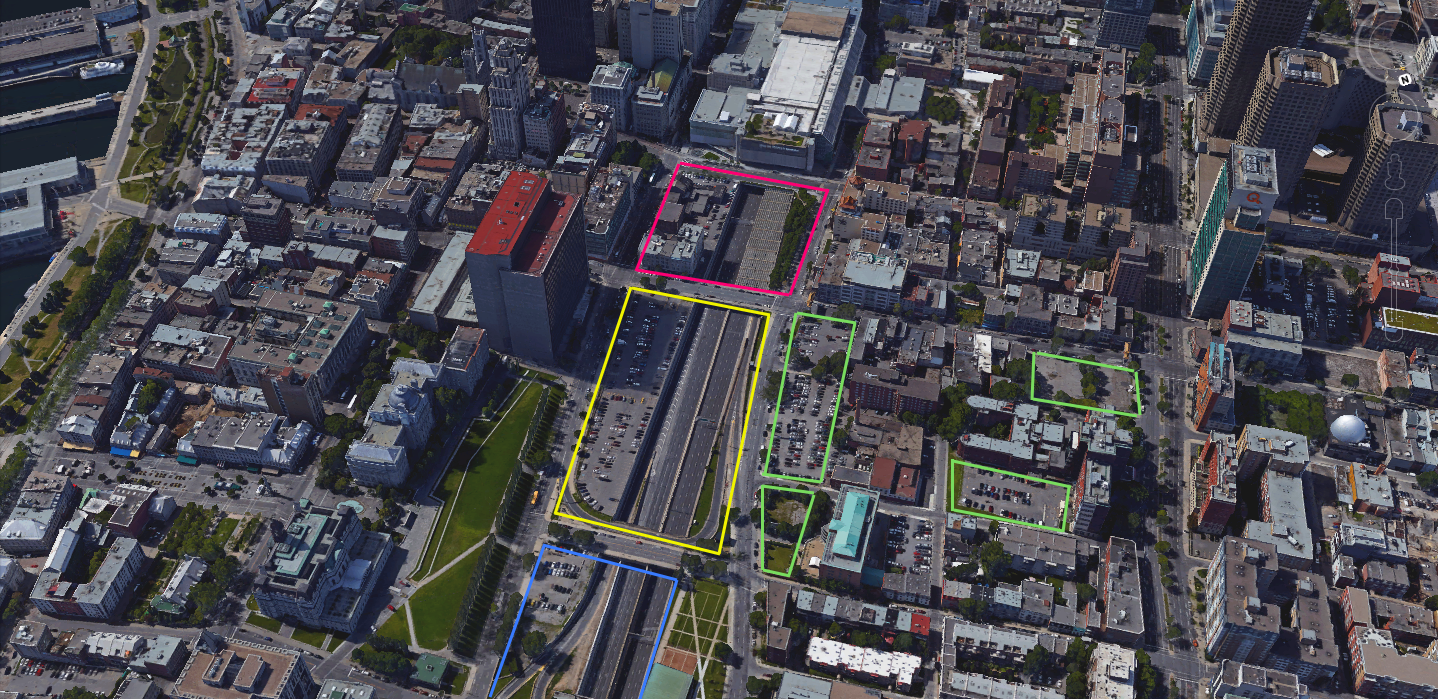 Cyan – planned public space, Canary – site 1, Magenta – site 2, Lime – potential high density residential development